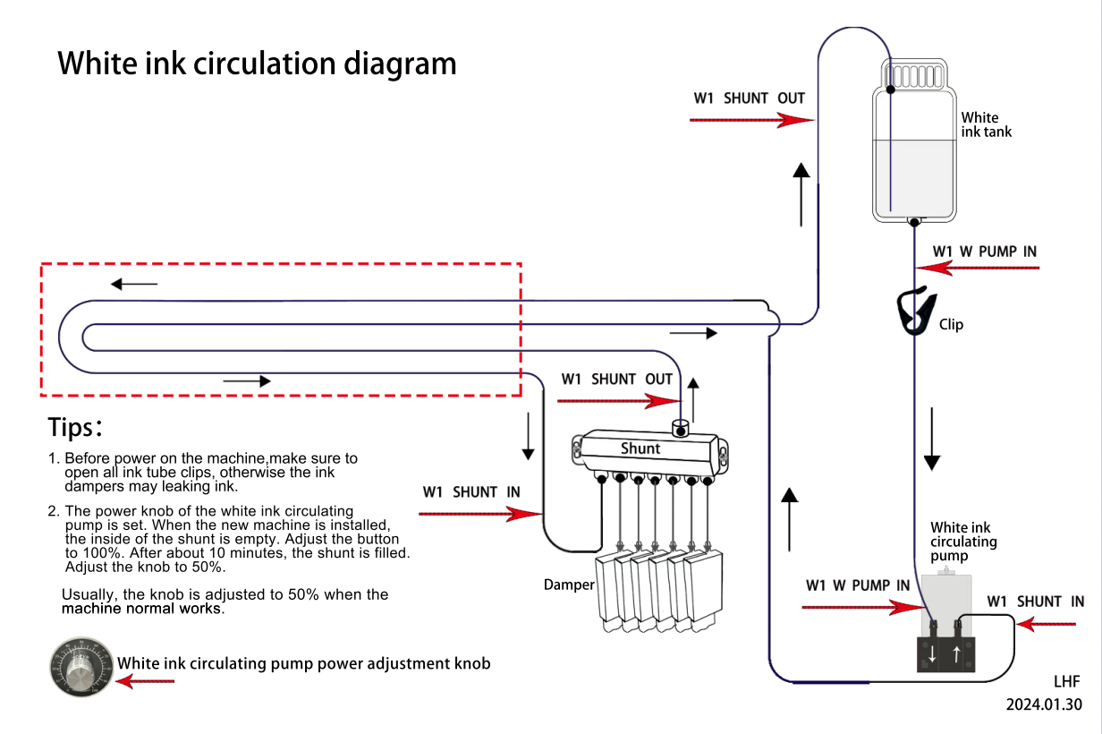 Turn on the printer power, turn on the white ink cycle knob, adjust to the maximum,