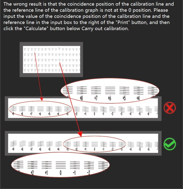 Step 2: Print the calibration chart line of "Step Adjust - Base Step" and check that the base step calibration line is aligned at position 0. If the calibration line is actually aligned at +1, enter "+1" in the pixel box, then click "Calculate", then click "Save" in the upper right corner to save the calibration parameters. If the calibration line is actually aligned at -1, enter "-1" in the pixel box, then click "Calculate", then click "Save" in the upper right corner to save the calibration parameters. Modify the values and print the calibration chart again to see if the 0 position of the calibration line is aligned.