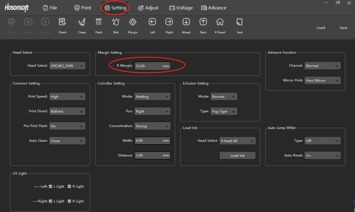 Generally, the margin value is adjustable within the range of 40-80mm. If the value is 0 or too large, it may exceed the machine's stroke and fail to print.