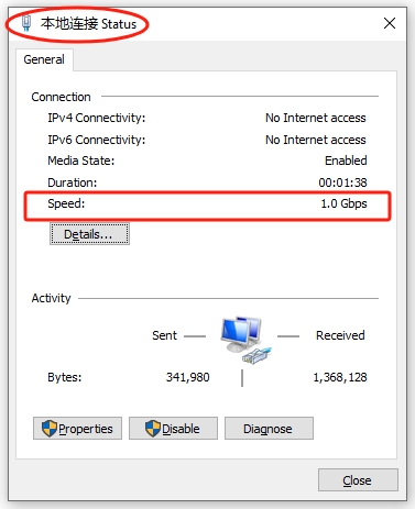 2. After the network cable is connected, check the Ethernet status and see if the "speed" is 1.0Gbps or above