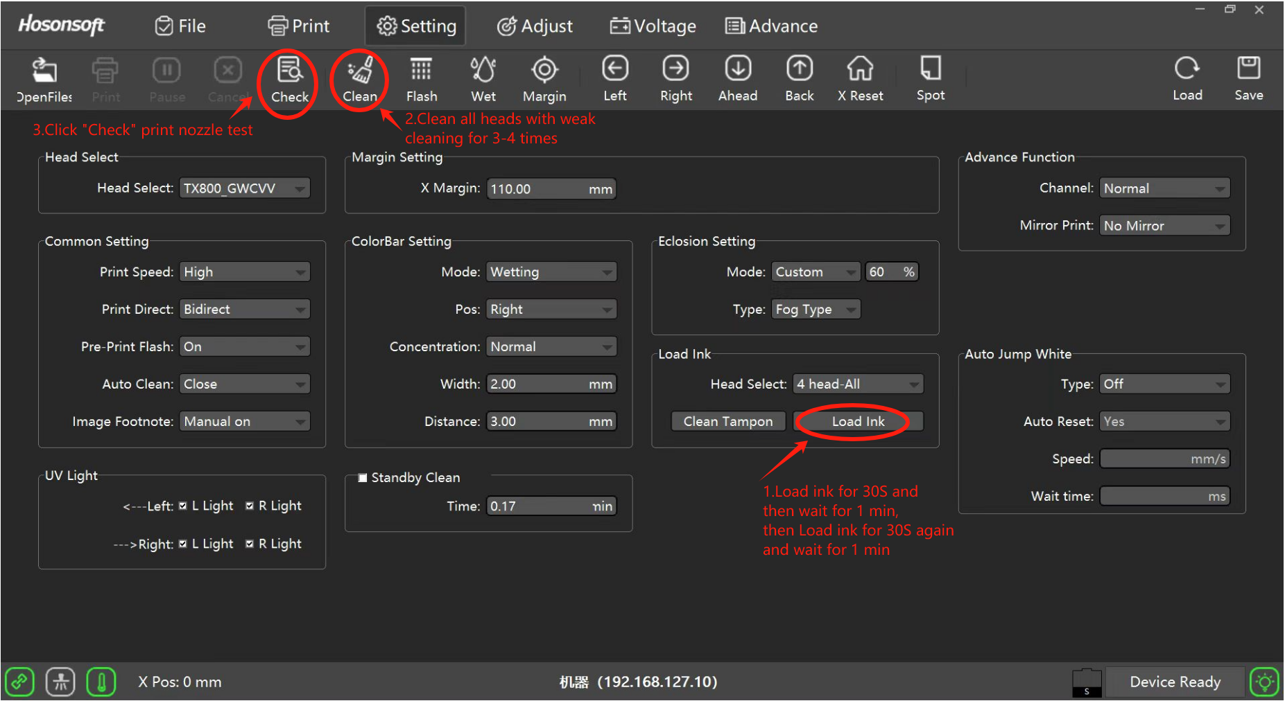 Clean the print head, click "Load ink" on the software to fill the ink, and then clean it multiple times to check if the nozzle has improved.