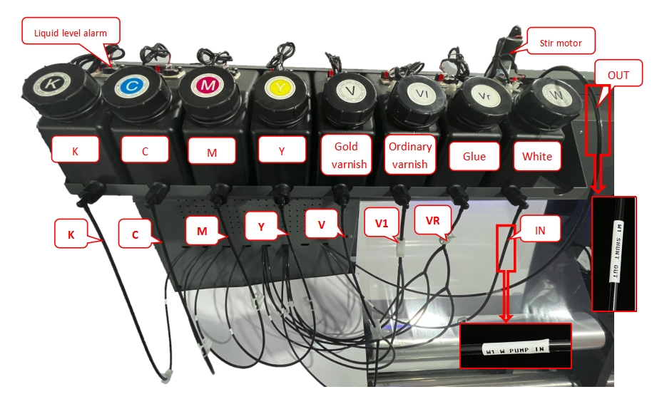 ignore the “V” ink tank, all the varnish ink tubes are connected to “V1” ink tank.