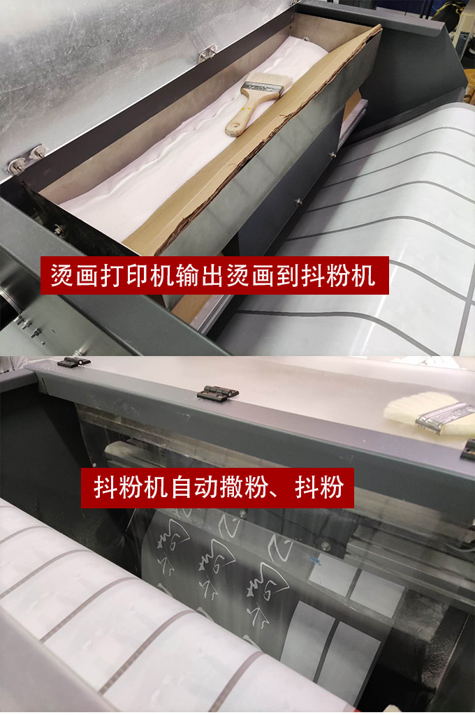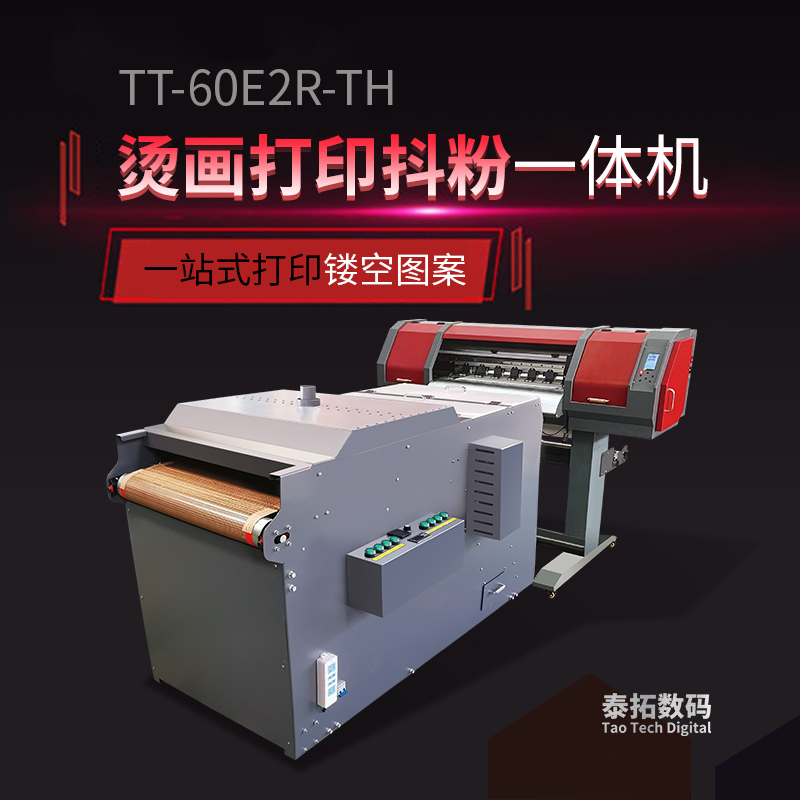 泰拓數(shù)碼的這款柯式燙畫打印抖粉一體機為給客戶帶來更好的燙畫打印方案,從很多方面進行技術革新,解決了薄膜噴頭容易堵塞、打印系統(tǒng)復雜以及燙畫牢度不夠等問題。