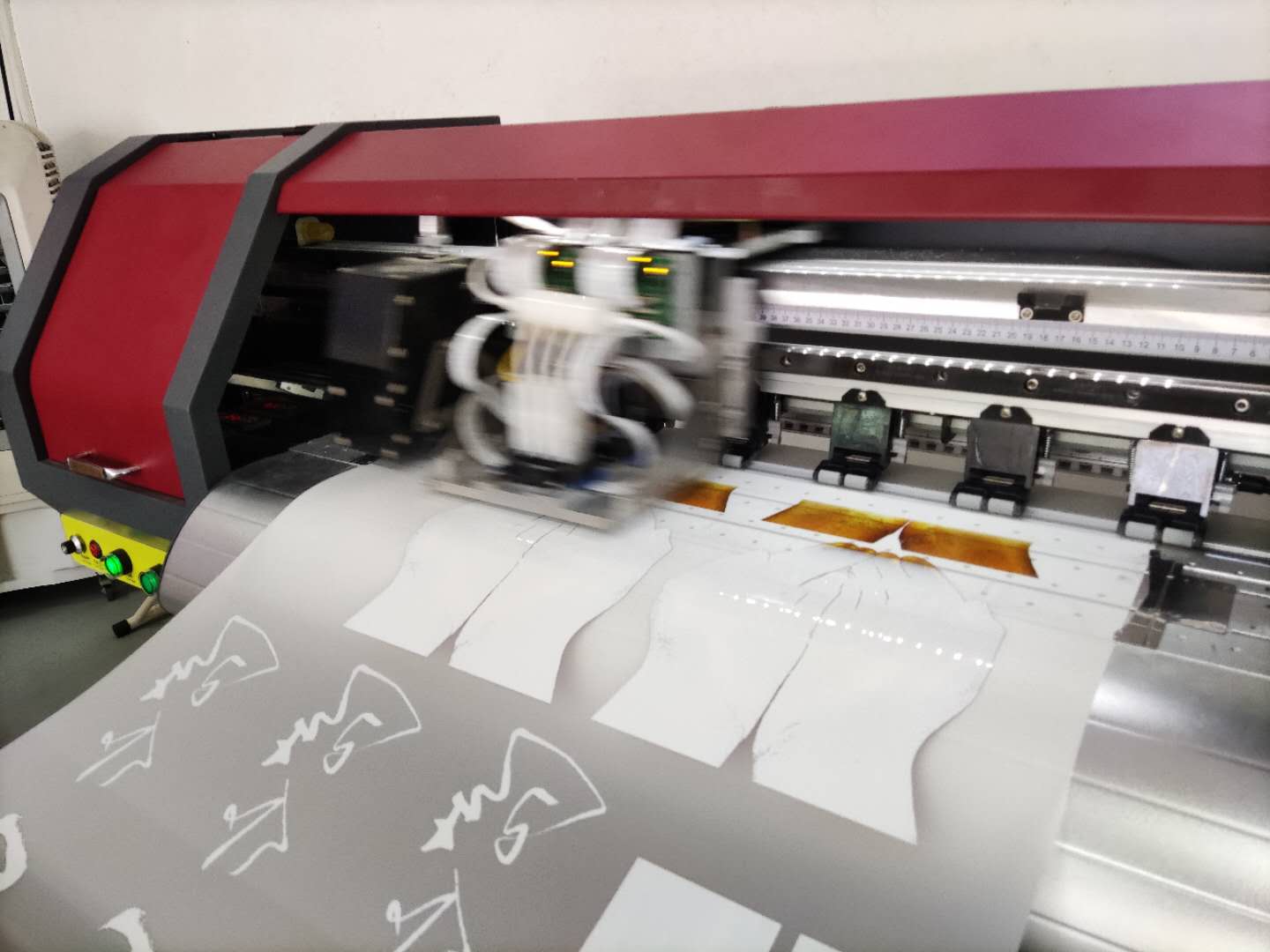 2、柯式燙畫打印機開始打印,白彩同出,彩色在下,白色覆蓋,可以打印任何顏色的圖案,打印的圖案就是鏤空效果的,無需再覆膜、刻字。