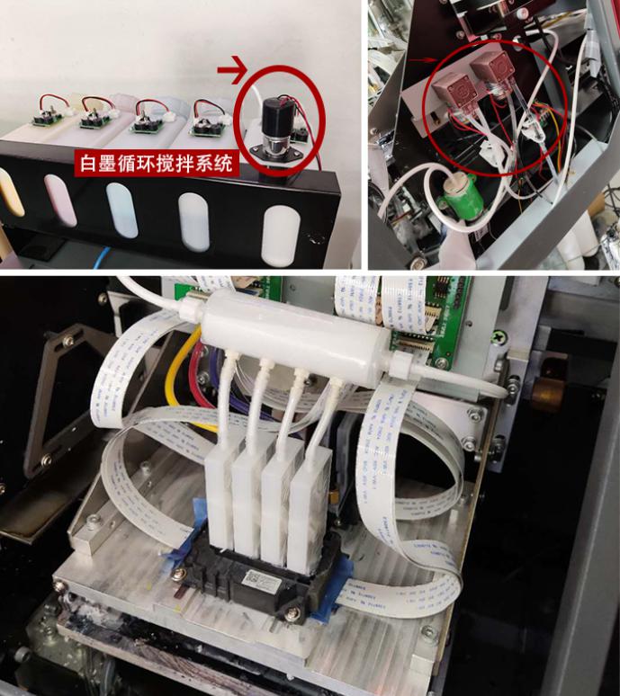 1、在配置上,這款燙畫打印機搭載2個4720噴頭,并且在四排聯(lián)供墨盒的基礎上配置了白墨攪拌墨路循環(huán)系統(tǒng),解決了很多客戶擔心的墨水沉淀帶來白墨噴頭的堵塞問題。同時設計了墨盒的缺墨報警裝置,墨水用完自動報警,保證能夠及時補充墨水,繼續(xù)打印。