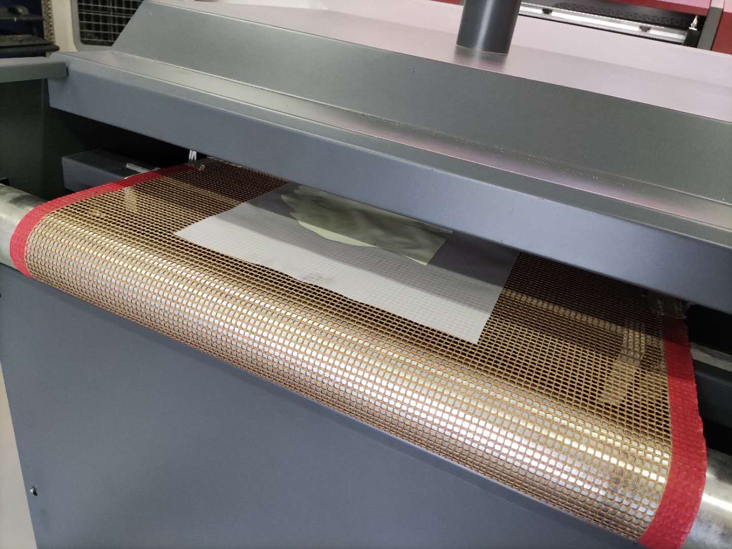 2、導帶輸送燙畫,進行熱熔粉的加熱,溫度為160度左右,整個烘焙過程大概為2—3分鐘,烘焙均勻,增加圖案的干濕擦牢度