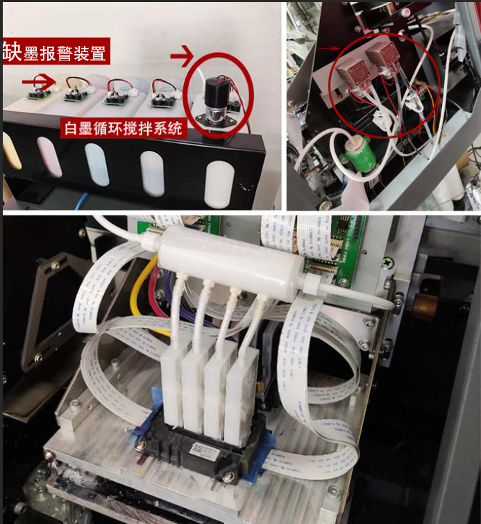 1、在配置上,這款燙畫打印機(jī)搭載2個(gè)4720噴頭,并且在四排聯(lián)供墨盒的基礎(chǔ)上配置了白墨攪拌墨路循環(huán)系統(tǒng),解決了很多客戶擔(dān)心的墨水沉淀帶來(lái)白墨噴頭的堵塞問(wèn)題。同時(shí)設(shè)計(jì)了墨盒的缺墨報(bào)警裝置,墨水用完自動(dòng)報(bào)警,保證能夠及時(shí)補(bǔ)充墨水,繼續(xù)打印。