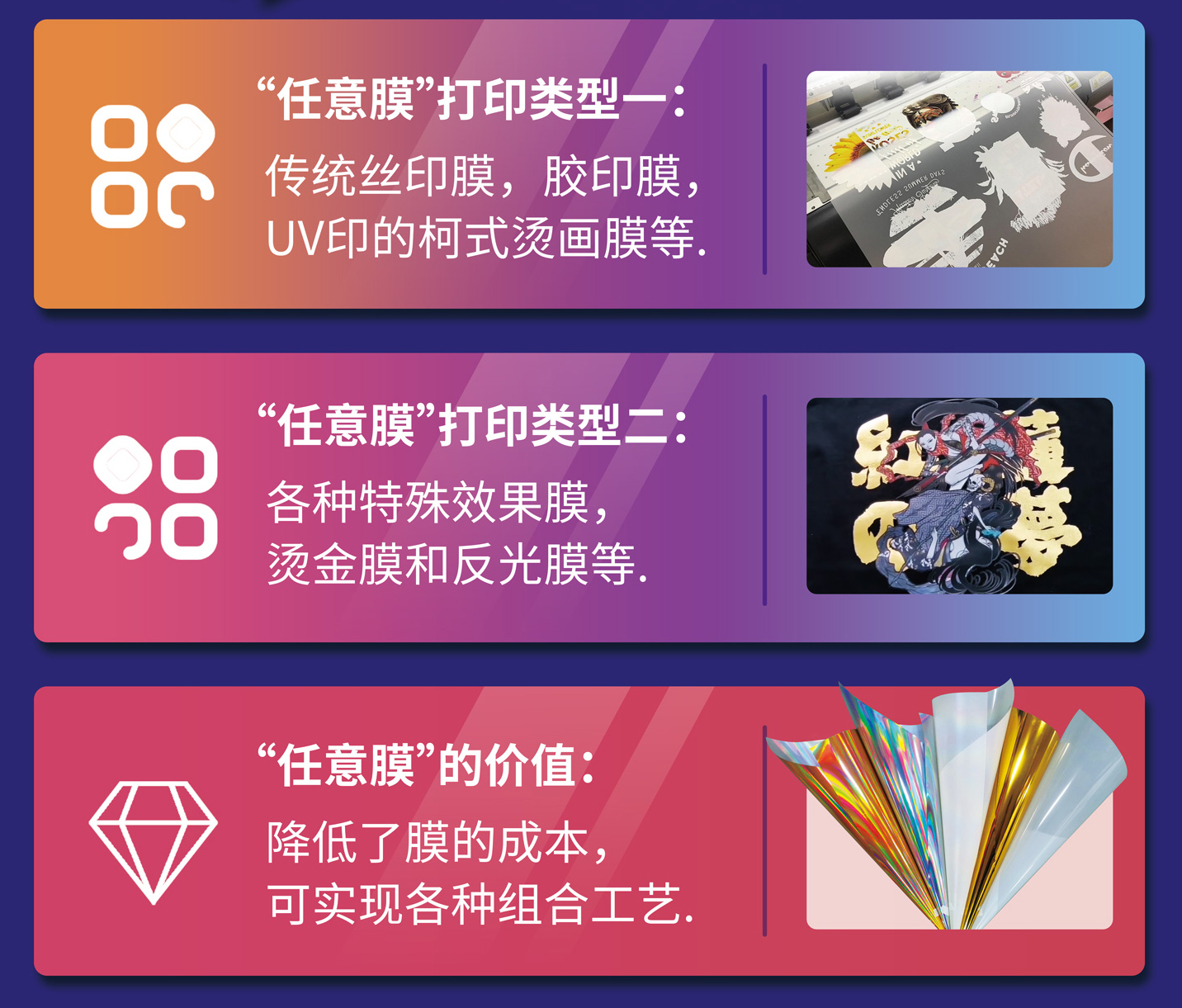 秉承著“創(chuàng)新領(lǐng)先,服務(wù)客戶(hù)”的宗旨,擁有著15年自主研發(fā)經(jīng)驗(yàn)的泰拓?cái)?shù)碼想你所想,經(jīng)過(guò)無(wú)數(shù)次的試驗(yàn),終于研發(fā)出“任意膜”技術(shù),增加一個(gè)噴頭打涂層,燙金膜、燙銀膜、鐳射膜、傳統(tǒng)膜、離型紙、反光膜、彩虹膜等皆可打印,膜的成本降低一半,還能夠?qū)崿F(xiàn)各種組合工藝!該項(xiàng)技術(shù)無(wú)疑將給印花界帶來(lái)更大的發(fā)展機(jī)遇!