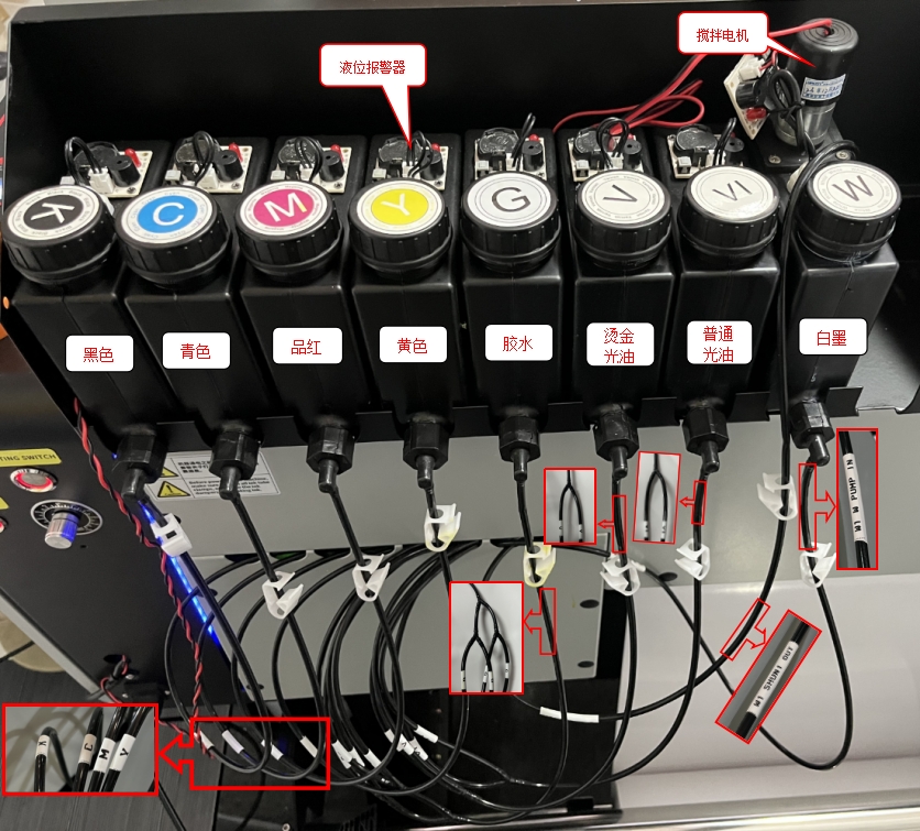 安裝固定主墨桶支架螺絲,然后將墨桶擺放整齊,并連接相應(yīng)的墨桶和相應(yīng)的標記墨管。