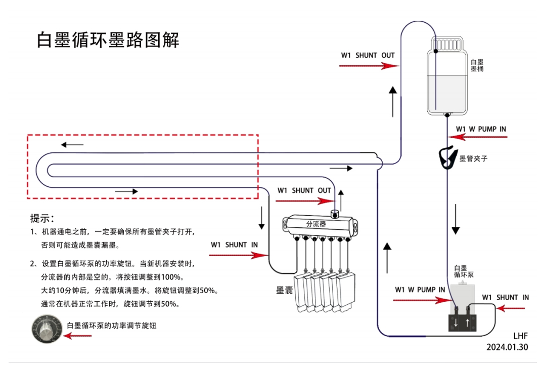 打開(kāi)打印機(jī)電源,打開(kāi)白墨循環(huán)旋鈕,調(diào)至最大100%,等待10分鐘,然后調(diào)整到50%。