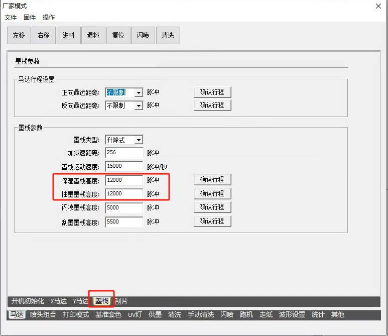 如果密封高低不正確時(shí),同時(shí)修改“保濕墨棧高度”和“抽墨墨棧高度”的數(shù)值,每次微調(diào)同時(shí)增加或減少它們“500”脈沖,